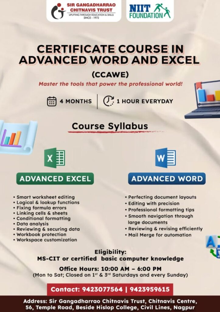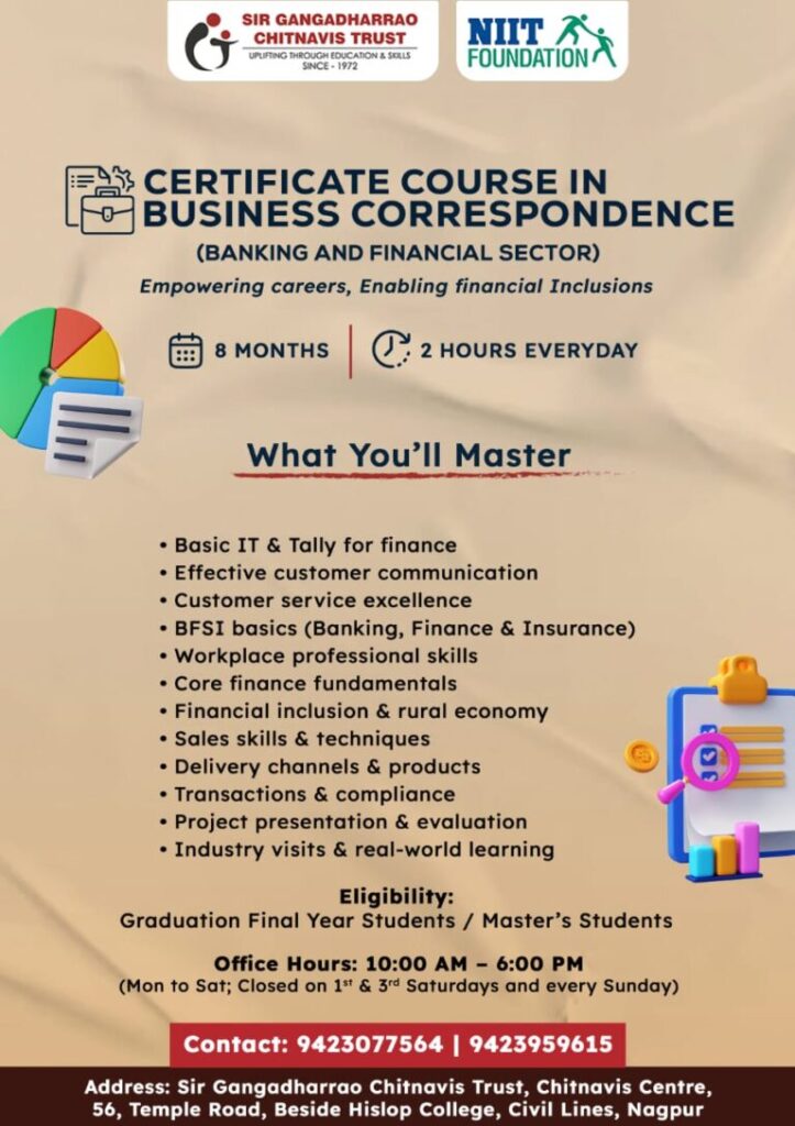 Computer training centres at Chitnavis Centre and Chitnavis Wada offer NIIT Foundation courses in Basic IT, Desktop Publishing, and spoken English to improve employability.
